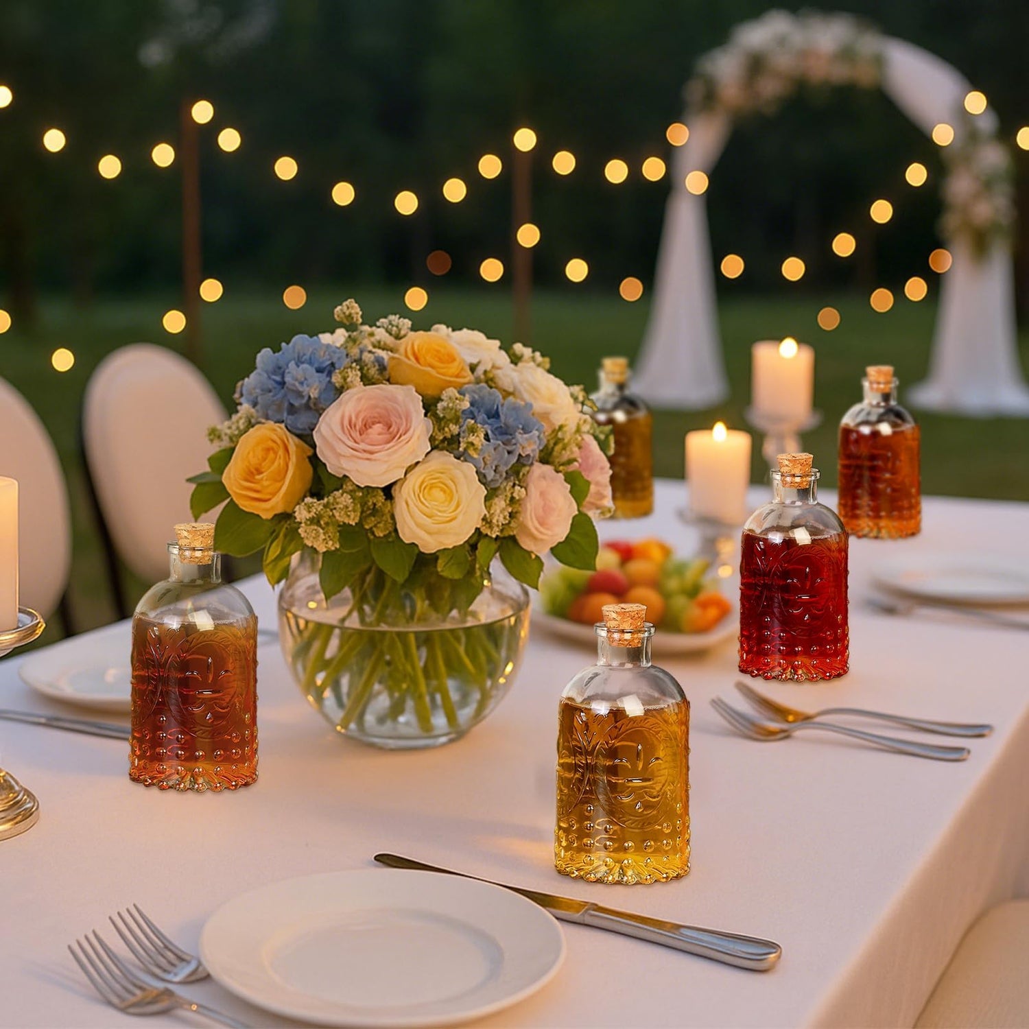 TBWIND 12 Pack 6oz Glass Bottles with Cork Stoppers, 200ml Clear Glass Liquor Bottles with 4 Vintage Patterns, Refillable Whiskey Bottles for Wine, Oil, Vinegar, Kombucha, Wedding Favors