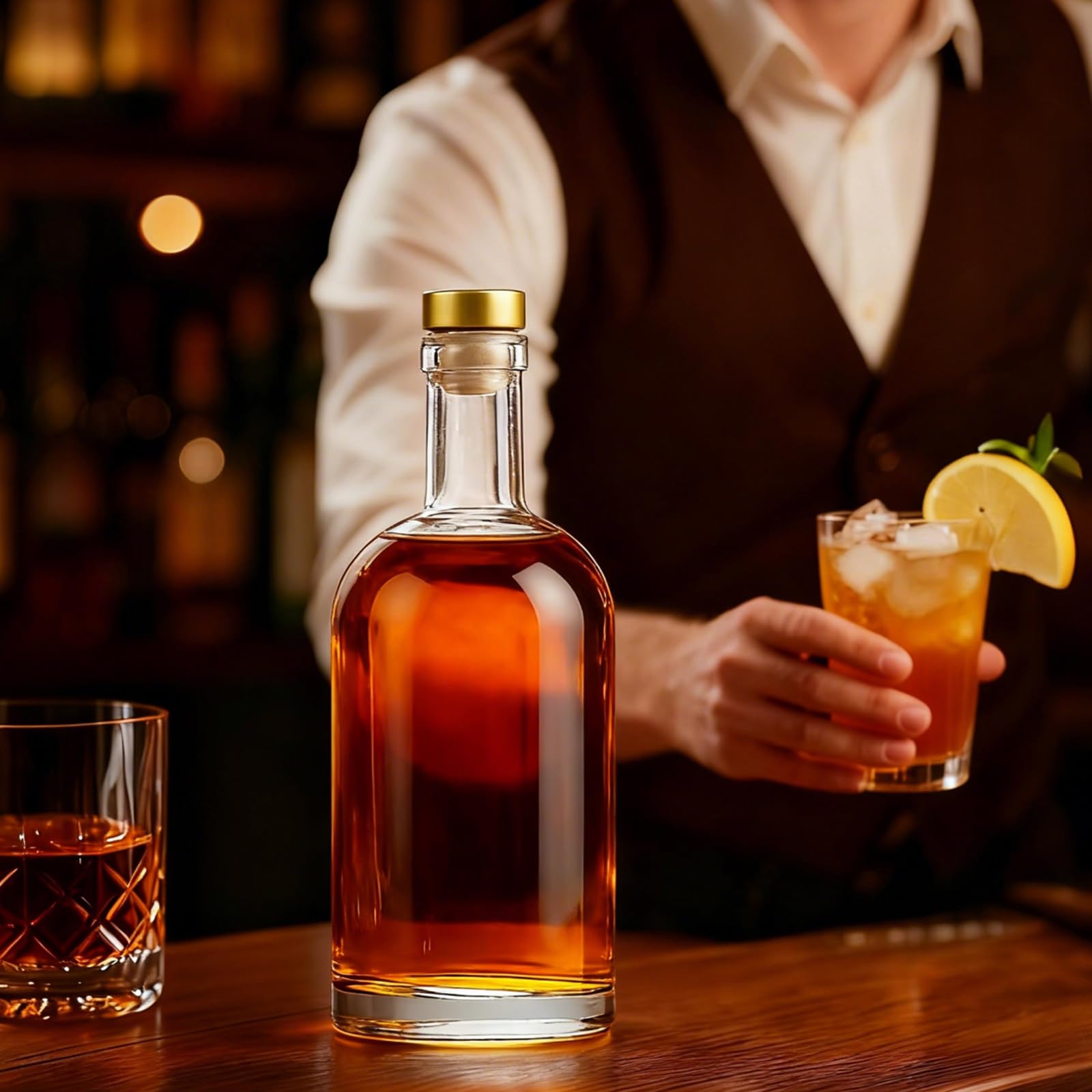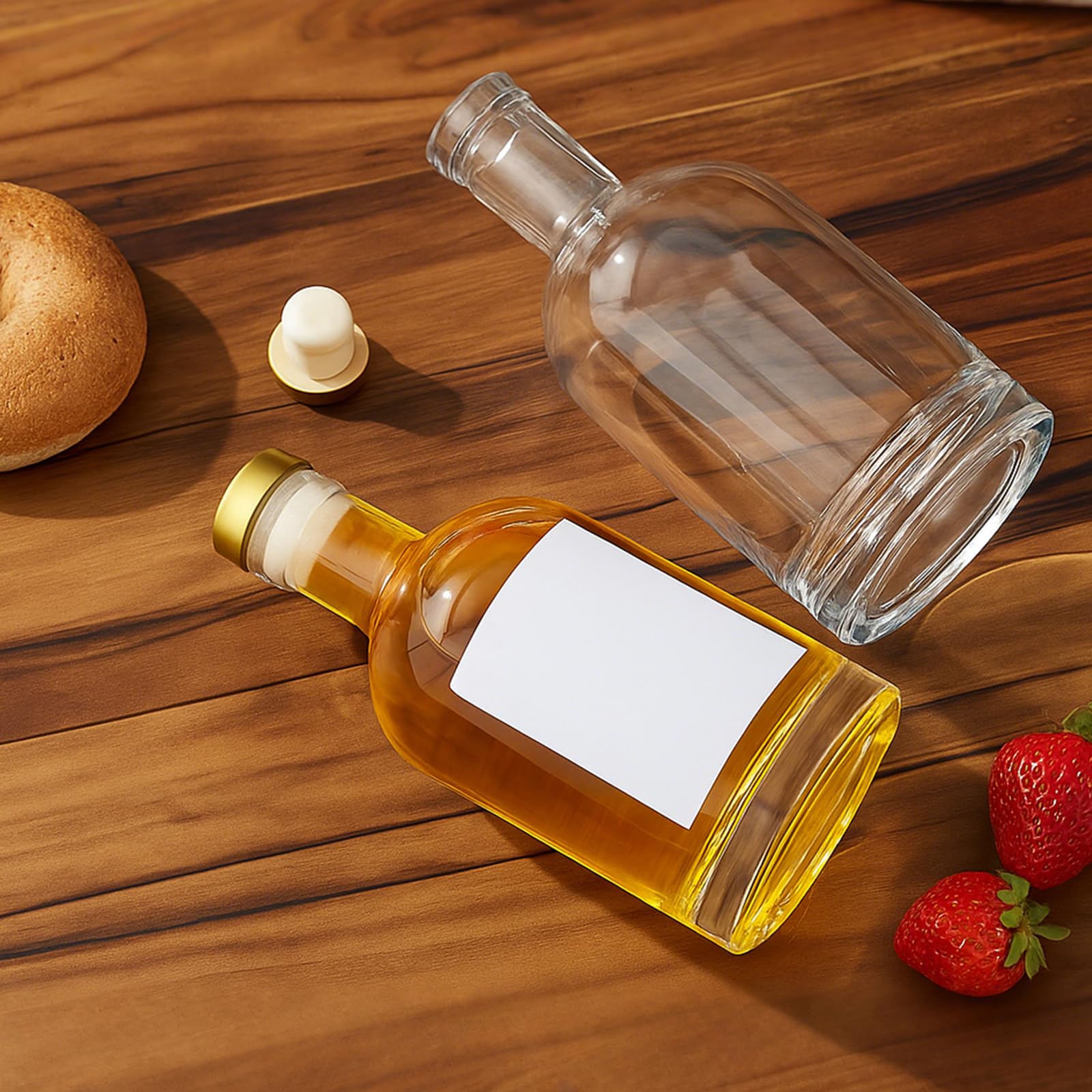 - Premium Clear Glass with Non Slip Base: Crafted from high-quality lead-free glass, these refillable liquor bottles feature a thick, smooth base for extra stability. The crystal-clear design highlights the rich color of whiskey, wine, oils, or kombucha, giving a professional look to your bar or kitchen.