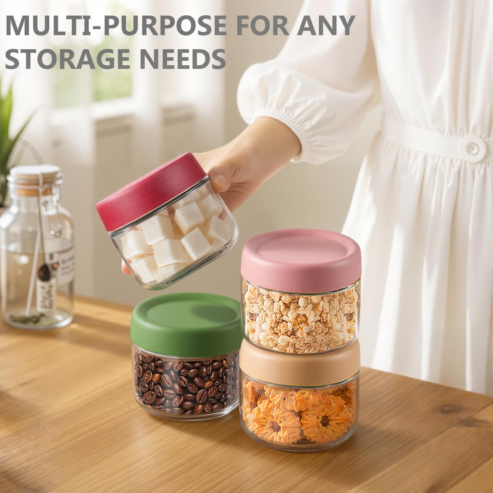- Dishwasher Safe (Jars Only): The glass jars are dishwasher safe, but we recommend hand washing the plastic lids to maintain their integrity and prevent any warping. The lid features a dual-seal design with a screw-on plastic top and an inner silicone sealing ring for extra airtight protection.