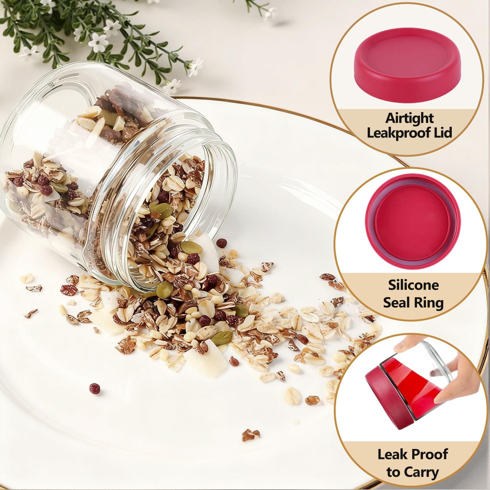 - Leakproof & Travel-Friendly Design: The airtight plastic lids feature a built-in silicone seal, ensuring a leakproof, mess-free experience. Whether you're meal prepping or packing breakfast for your commute, these 10oz glass jars keep contents secure and fresh on the go.