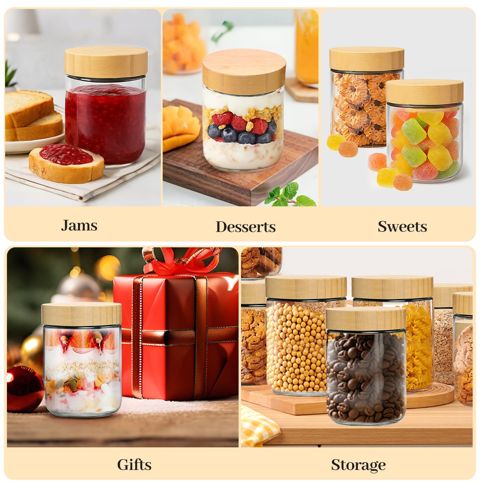 • Dishwasher Safe (Jars Only): The glass jars are dishwasher safe, but we recommend hand washing the bamboo lids and spoons to maintain their natural integrity and prevent warping. The lid features a dual-seal design with a screw-on bamboo top and an inner silicone sealing ring for extra airtight protection.