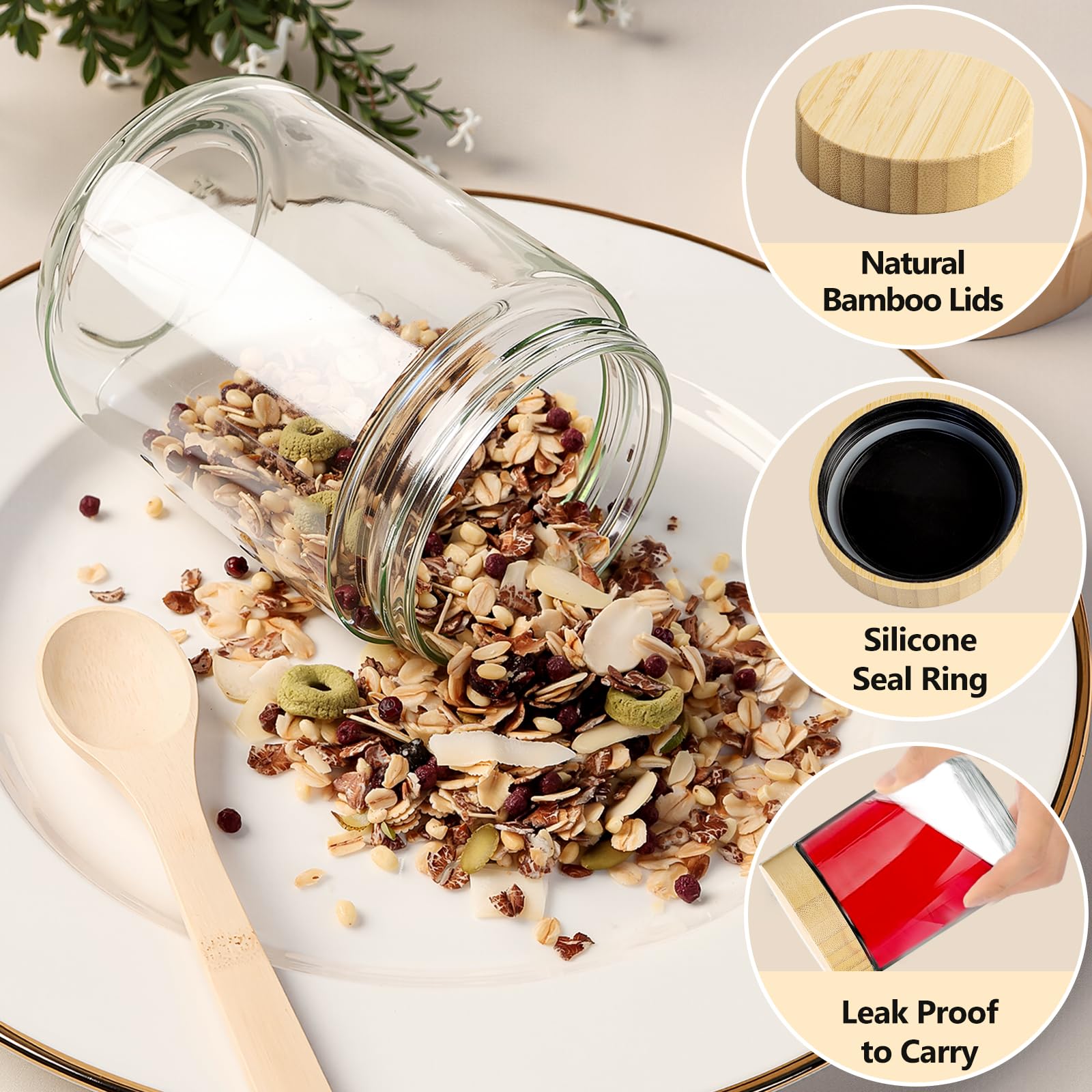 • Leakproof & Travel-Friendly Design: The airtight bamboo lids feature a built-in silicone seal, ensuring a leakproof, mess-free experience. Whether you're meal prepping or packing breakfast for your commute, these 16oz glass jars keep contents secure and fresh on the go.